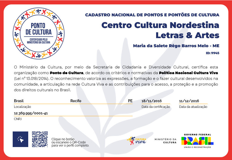 Ponto de cultura, reconhecido pelo Ministério da Cultura, em abril de 2016. Reúne apreciadores das letras e das artes.