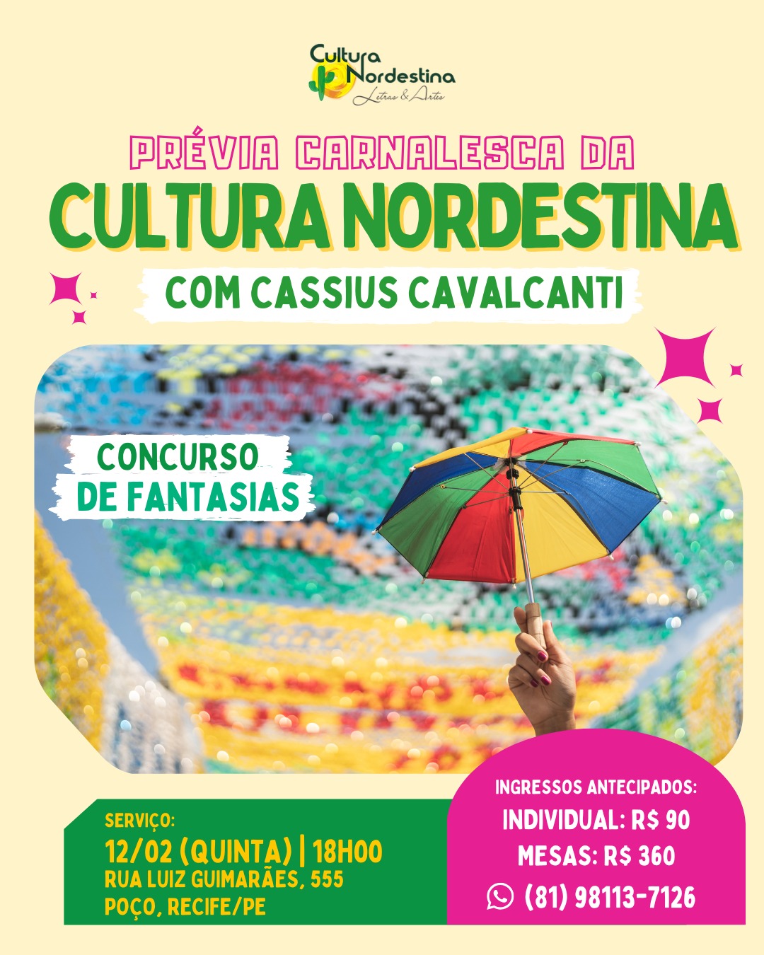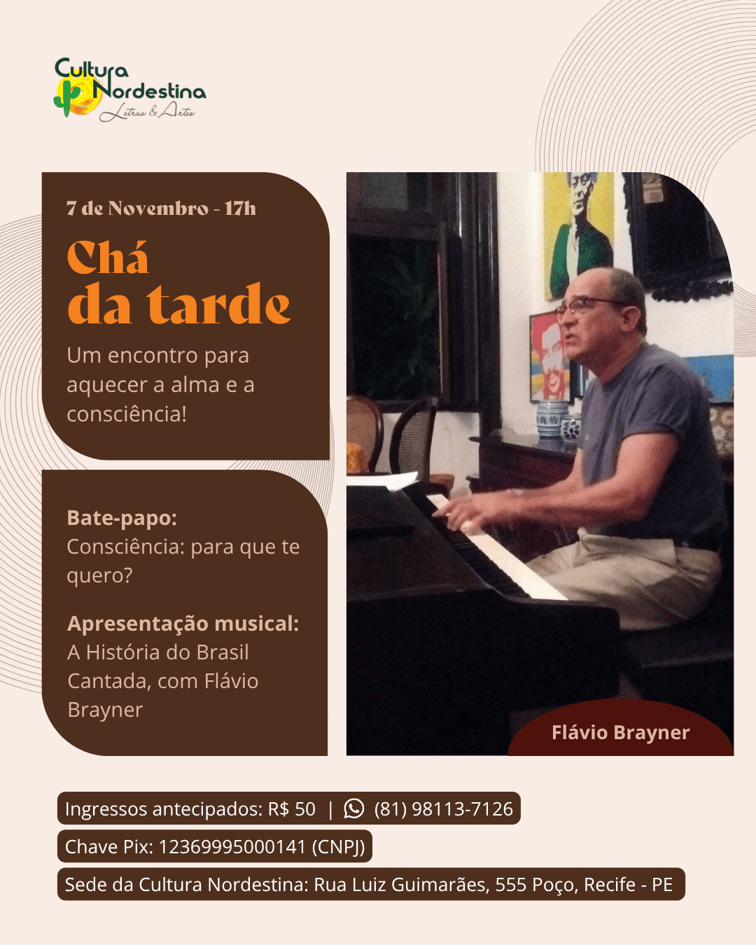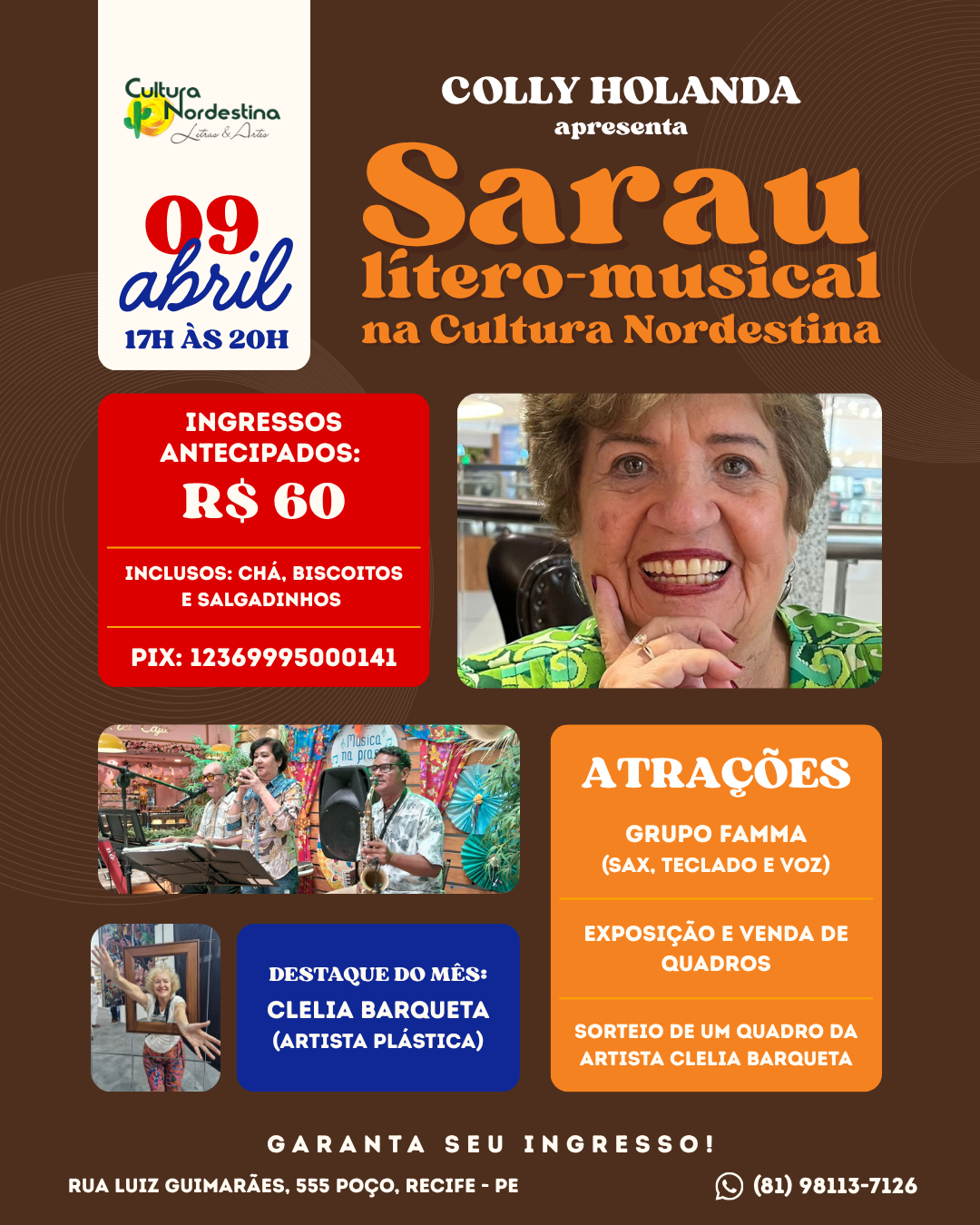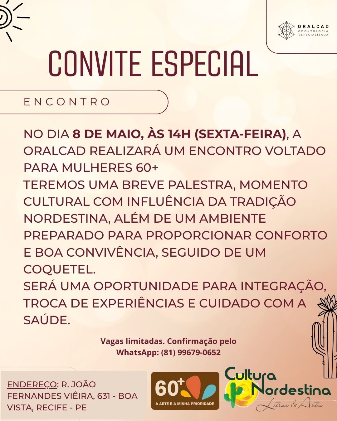 É com esta perspectiva que o Ponto de Cultura Nordestina faz o convite a você, que valoriza a arte, a cultura e a sua autonomia, para participar do programa 60+ “A arte é a minha prioridade”, lançando uma proposta desafiadora: priorizar a arte vivendo cada dia como se fosse o primeiro.